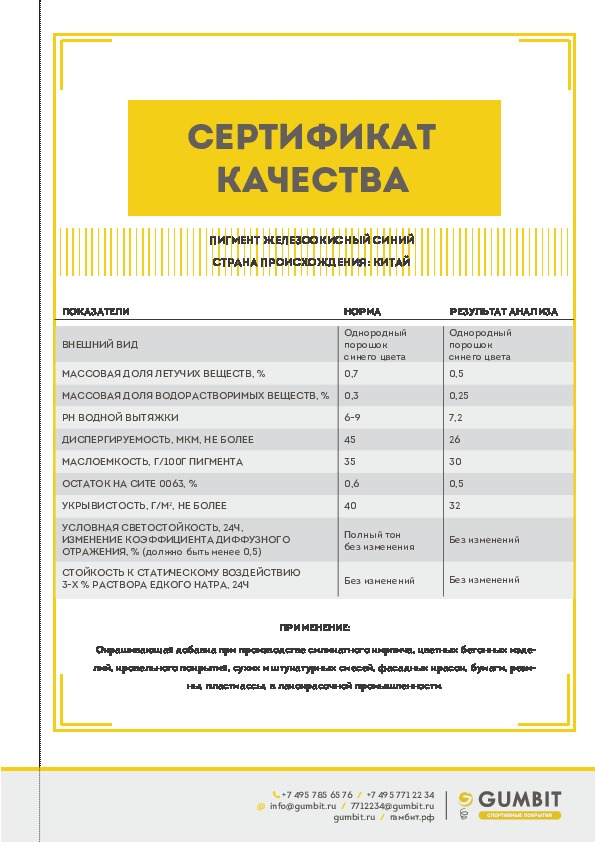 Данный пигмент используется для стабилизации цвета и увеличения светостойкости синего пигмента в резиновых покрытиях. Также данный пигмент может использоваться для расширения цветовой гаммы покрытий