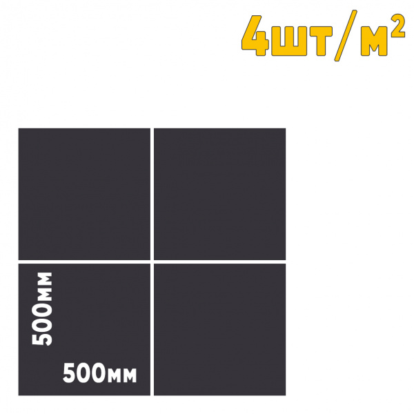 Резиновая плитка размером 500 х 500 мм представляет собой золотую середину. Она достаточно компактна для укладки в не очень широких местах, но не требует столько внимания и времени при монтаже, сколько нужно уделить на плитку более мелкого размера. Чередование плиток разного цвета позволяет сделать геометрический узор. Ещё более простой и быстрой укладку делает использование резиновой плитки 500 х 500 мм с втулками. Один квадратный метр занимают четыре таких плитки.